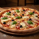 Pomodoro pelati, mussarela, palmito, bacon, alho aromatizado, parmesão, manjericão e azeitonas pretas
