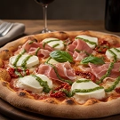 Pomodoro pelati, mussarela de búfala, presunto parma, tomate seco e molho pesto