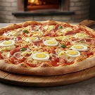 Pomodoro pelati, presunto, ovos, cebolas, coberta com mussarela